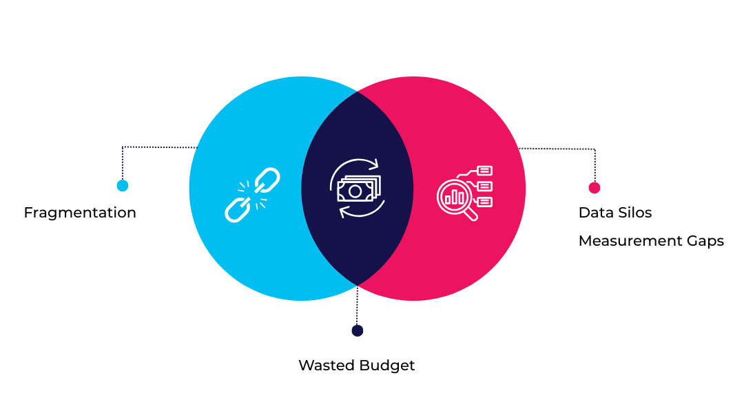 Many data systems still operate in silos—CTV platforms, mobile ad networks, and website analytics often don't communicate—making holistic attribution and consistent messaging difficult.